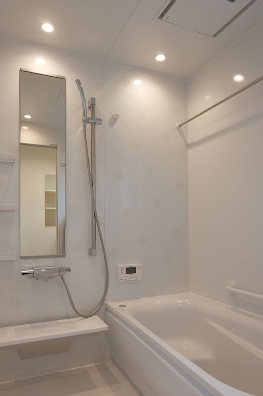 システムバス標準仕様のバスルーム”TOTOサザナ”。明るく優しい雰囲気が漂う空間は、一日の疲れを癒してくれそうですね。(アクセントパネル:ブーケットホワイト) -