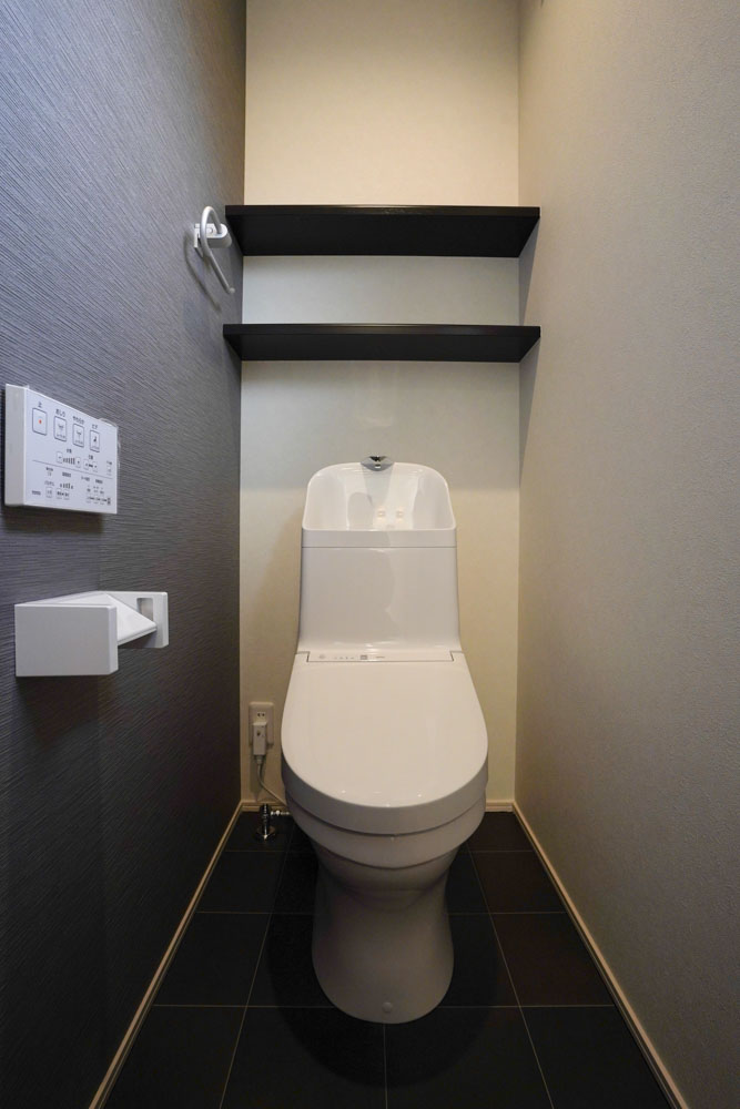 2F標準トイレ(クッションフロア:サンゲツ HM11109/アクセントクロス:サンゲツ FE74692/固定棚:DAIKEN ハピア オフブラック)