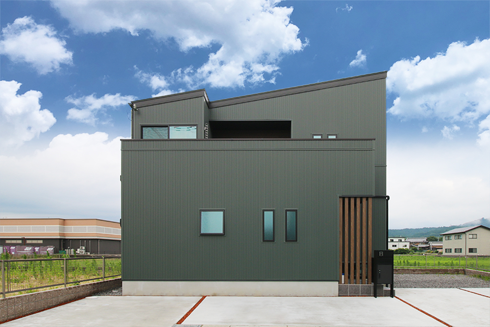 モスグリーンのガルバリウムがカッコイイ!!若いN様ご夫婦にぴったりの 素敵なお家が完成しました。ご主人自慢の愛車が映える こだわりのスクエアデザイン。