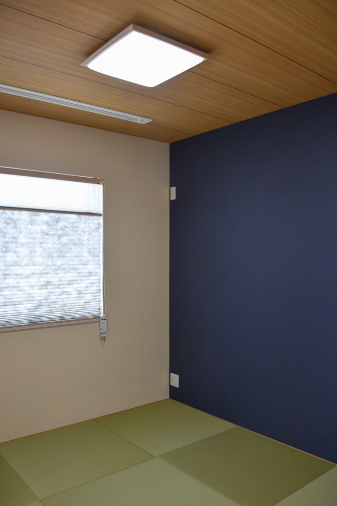 洋和室は和紙調のクロスで和の雰囲気を残しています。(畳:DAIKEN 清流 銀白色/畳寄せ:DAIKEN ハピア ミルベージュ/壁アクセントクロス:サンゲツ FE6250/他3面壁クロス:シンコール SLP901/天井クロス :シンコール SLP907)
