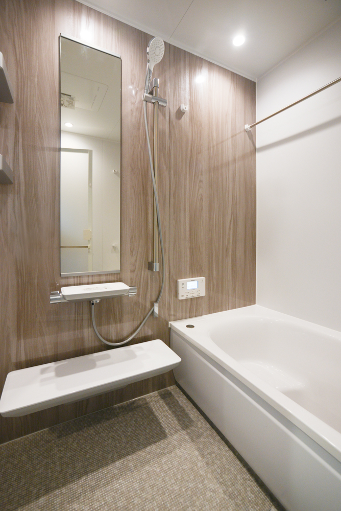 バスルーム(TOTO サザナ Tタイプ アクセントパネル:グレイッシュウォルナット/床:ライトグレーラグ調)