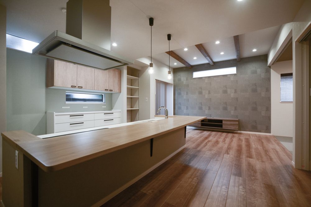LDKナチュラルとスタイリッシュがバランス良く入り混じるカフェ風のLDK。腰壁カウンターでおさめたアイランドキッチンが大きな存在感を放ちます。