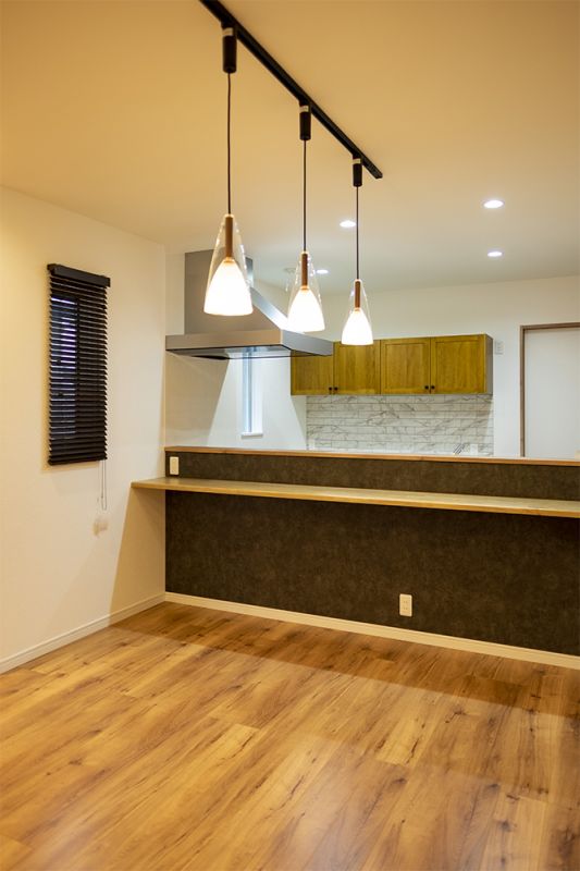 パソコンコーナーダイニングとリビングの一角には、大人2人が並んでも充分な幅のあるカウンター。パソコンコーナーを想定していますが、時に読書やお勉強してもらうのにも良いですね。 -
