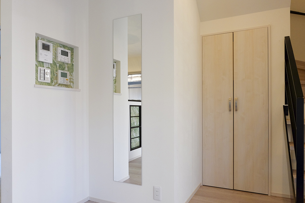 身だしなみチェック用のミラーとリモコンニッチ(下枠:DAIKEN ハピア ネオホワイト)