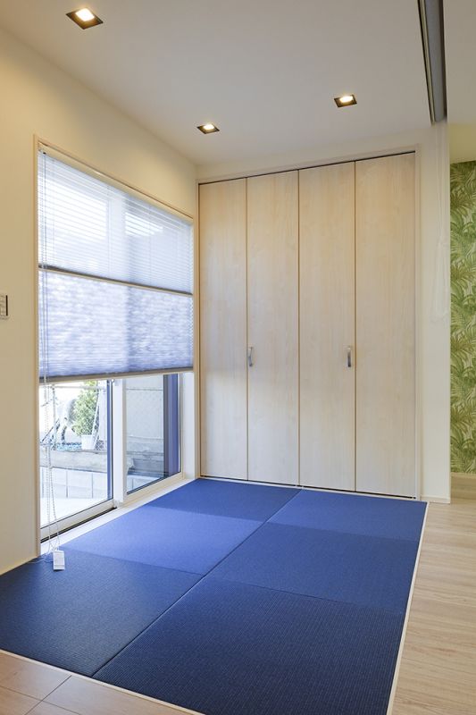 畳スペースご夫婦の寝室としてリビング横に設けられた畳のスペース。 ホワイトベースの空間にブルーの畳がきれいに映えます。 就寝時は、上部のロールスクリーンを下ろすことでプライバシーを確保していただけます。 (クローゼット扉:DAIKEN ハピア ネオホワイト/畳:DAIKEN 清流 藍色/照明:DAIKO DDL-5111YB) -