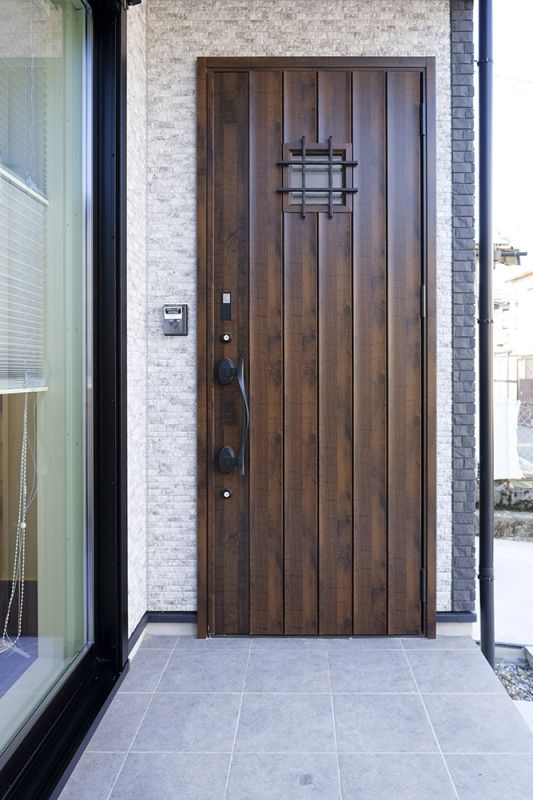 玄関ポーチアンティーク風のダークな木目にアイアンの格子があしらわれた、重厚な装いの玄関ドア。 背面のサイディングやポーチタイルとのメリハリも利いています。 (玄関ドア:LIXIL ジエスタⅡ D34型 アンティークオーク・ハンドル:D型 シルキーマットブラック/玄関タイル:東洋石創 スパニッシュストーン TZ-411G) -