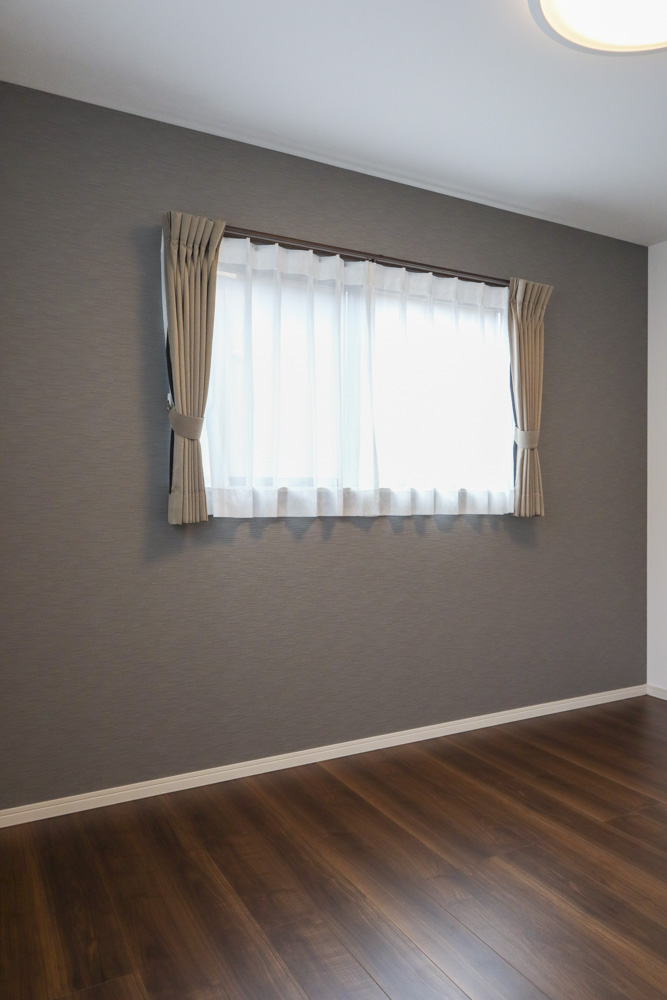 LDK床と梁の色はナチュラル色で統一し、TV背面・グレーのアクセントクロスがさり気なく目を引きます。