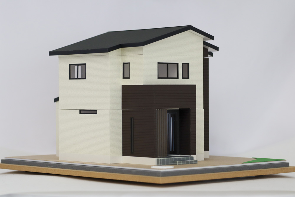 ホワイトベースにダークブラウンの木目を組み合わせた切り妻屋根の外観。
