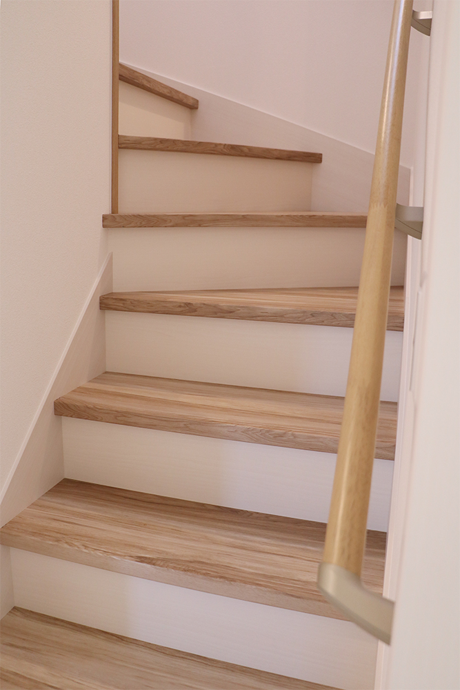 階段:DAIKEN 踏板:ペカン柄/蹴込・側板:モダンホワイト/笠木・手すり:ライトオーカー