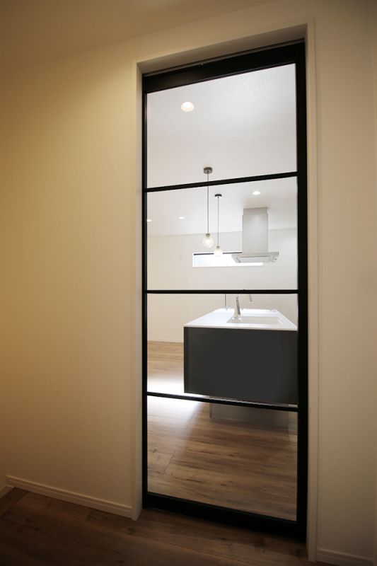 リビングドア階段ホールとLDKの間仕切りには、ブラックフレームのガラスパーティションを採用。ガラスにすることで、窓が取れない階段ホールもLDKから光を取り込むことが可能です。また、空間を繋げて見せることで、より広がりを感じさせてくれます。