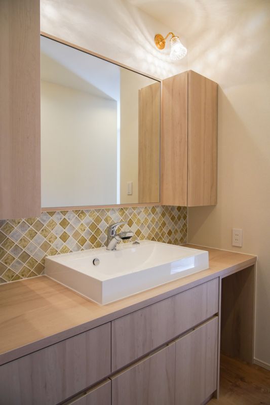 マイスリー「オリジナル造作洗面」造作洗面は施工事例を何度も見て参考にした上でデザインを決めました。使いやすさを考慮し、上の戸棚は扉付きに変更しています。お部屋全体のコンセプトである、ナチュラルテイストにマッチした仕上がりになりました。(造作収納:アイカ メラミン 木目 LJ-10002K/タイル:名古屋モザイク クリクレア KUL-05 目地:ホワイト/クロス:サンゲツ FE74537 白左官塗り調 壁:その他 ベースSP2805 ベージュ 天井:SP2843 白/床:DAIKEN トリニティ チェスナット/照明:オーデリック OB 255 137L) -