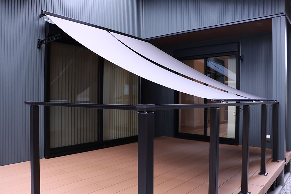 ウッドデッキLDKから繋がる広々としたウッドデッキにはスタイルシェードを付けられました。日差しをカットしながら、目隠しとしても活躍してくれます。心地の良い風を感じながら快適な時間をお過ごしいただけそうですね。 -