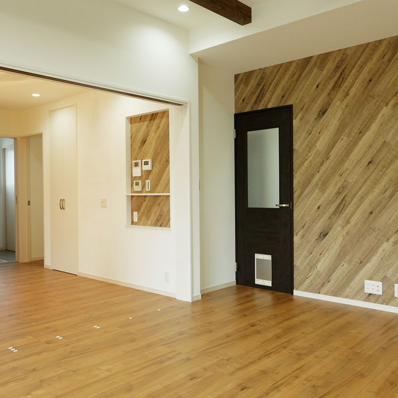 LDK「アクセントクロス」LDKのTV設置面の壁と、ニッチの背面には木目柄のクロスを選んでいただきました。斜め模様のクロスはそれだけでクールなイメージです。ブラックのリビングドアとのコーディネートもおしゃれですね。 -