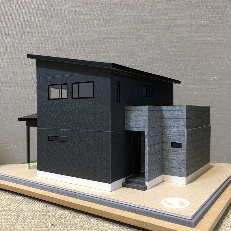 ブラックの外壁に石目調のグレーの外壁をアクセントにすることで、スタイリッシュでかっこいい外観にまとまりました。(外壁メイン:KMEW カルナック マックスチタンブラック/外壁アクセント:KMEW フィエルテQF フィエルテ チタンアイロン/屋根:ガルバリウム鋼板 SELiOS prime つや消し ダークグレー/破風板:神島化学工業 Wチャコールブラック/軒天井:ニチハ 木目調 ML673V ダーク/サッシ:サーモスⅡH ブラック/雨樋(軒樋):Panasonic シルビスケア 60角 ブラック)