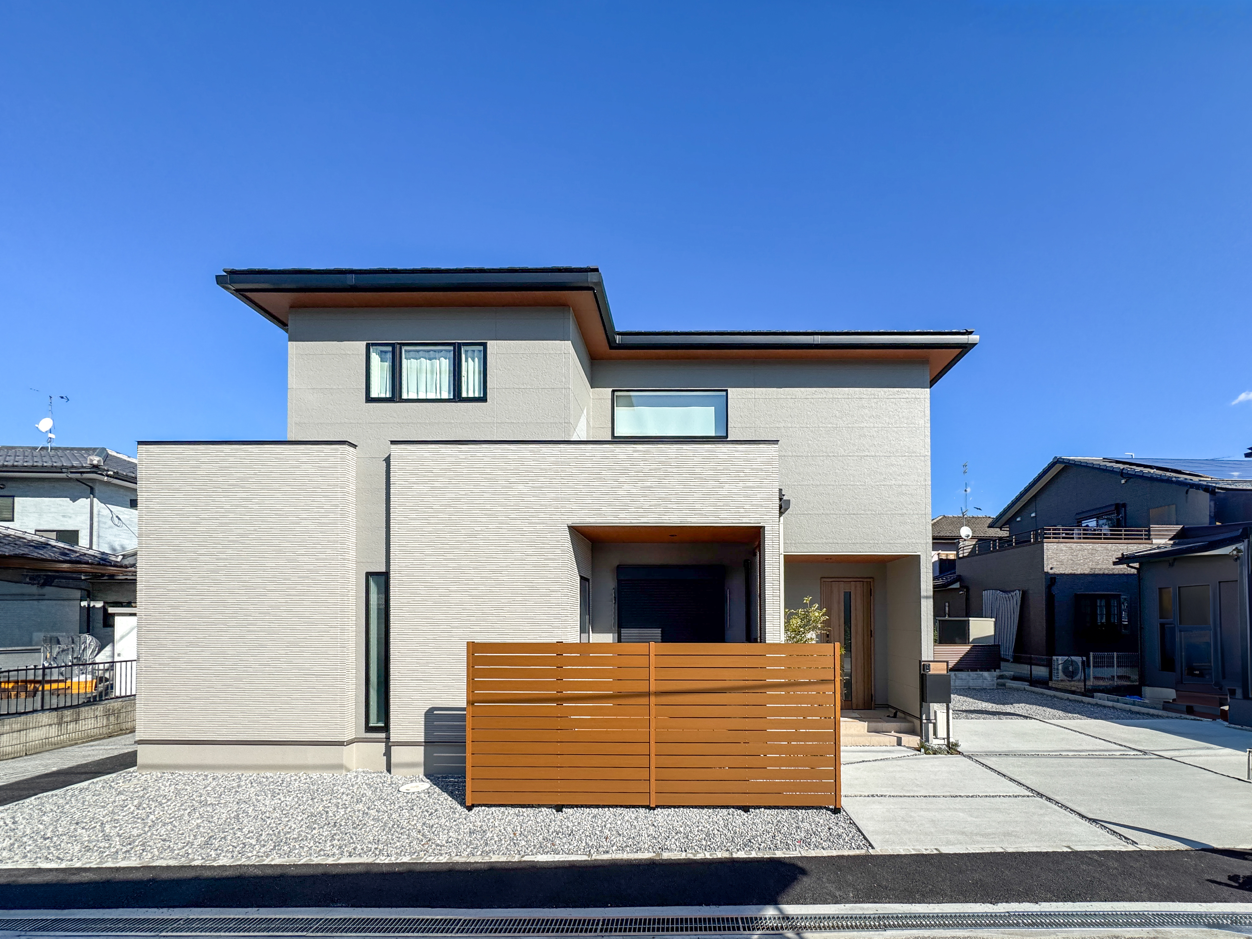 切妻屋根に立体感のあるスリットデザインが効いたモダンな外観。