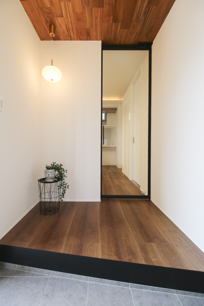落ち着いたブラックの外観に木の温もりが調和した平屋の佇まいが、帰る度に心を穏やかにします。