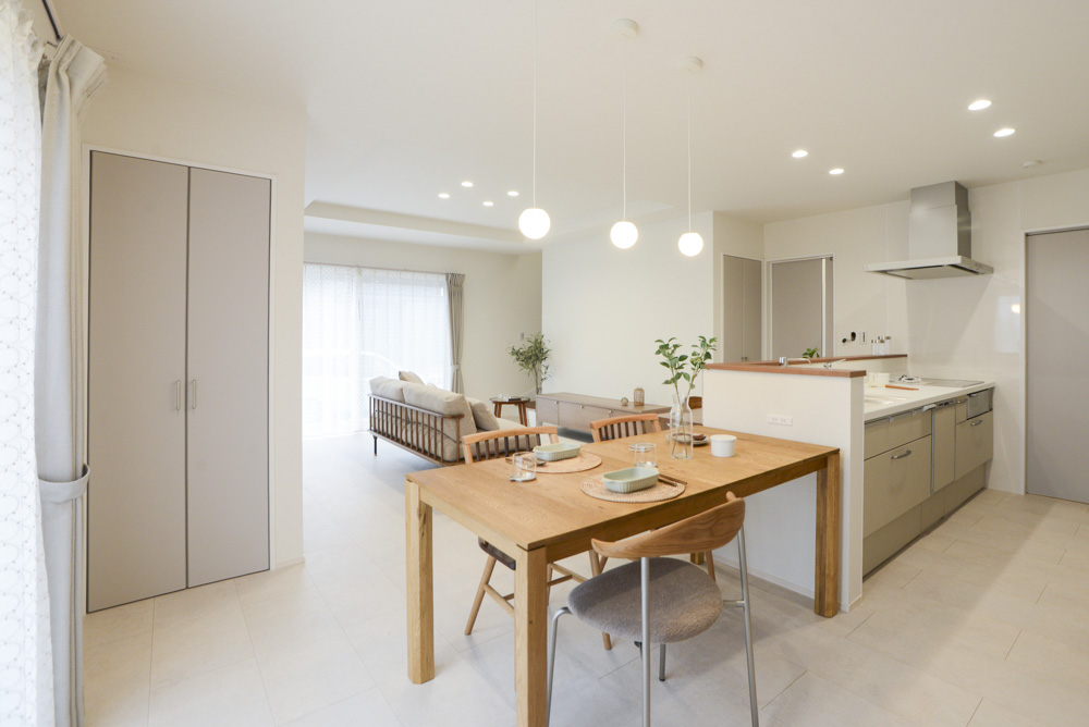 爽やかなホワイトベースの室内に、突板の豊かな木目と無垢建具が自然の温もりを添えています。