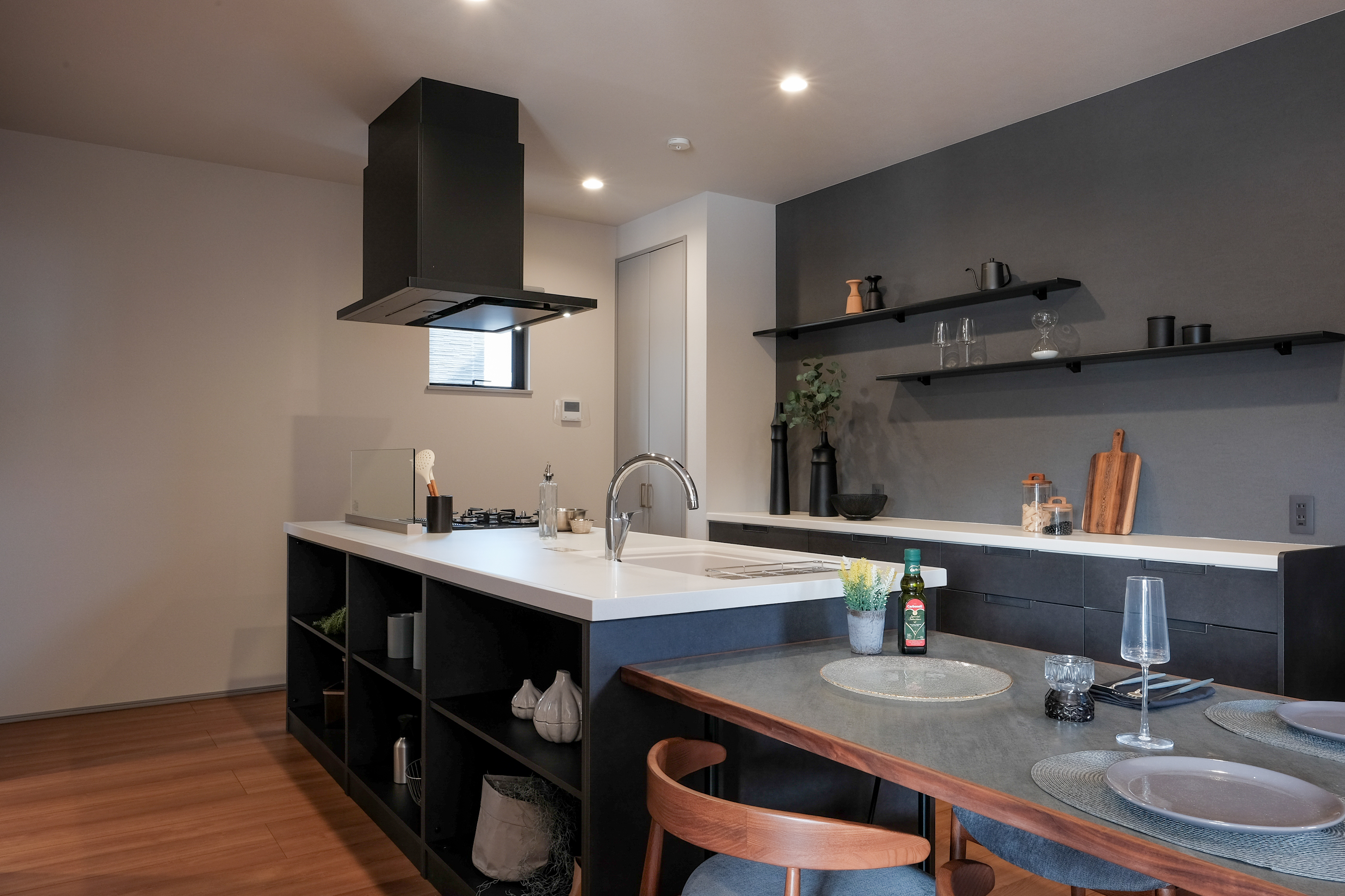 内観は床材には柔らかなアッシュホワイトを採用し、ブラックの建具が織りなすコントラストがシャープな空間を演出。