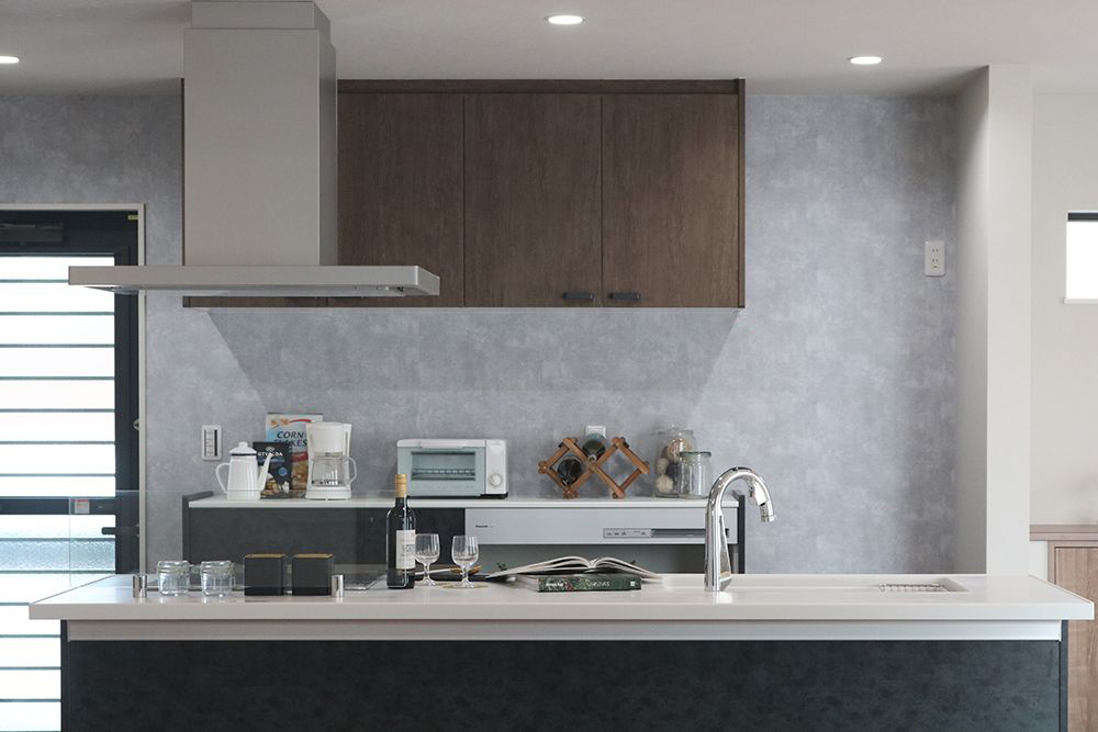 ブラックの枠をアクセントにした吊り戸には、「アンティーク・ランパート」というコンクリート調のクロスを貼ることで、スマートで洗練されたスタイルに仕上げました。