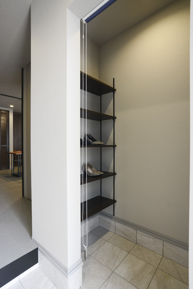 玄関ホールハイドアで縦のつながりを演出した玄関ホール。クリアグレーのガラスドアとパールグレーの収納扉が空間にやさしく溶け込み、第一印象で上質さを感じる空間に。