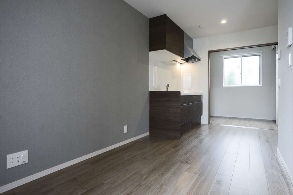 105・106・205・206号室 LDK(モダンスタイル) ※写真は106号室ダークカラーが大人の落ち着きを感じさせるモダンスタイルのお部屋。