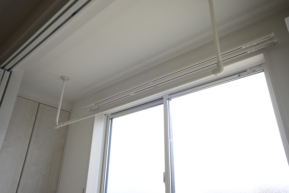 106号室 サンルーム(モダンスタイル)腰高の収納やインテリア性のあるブラックのハンギングバーを設けました。