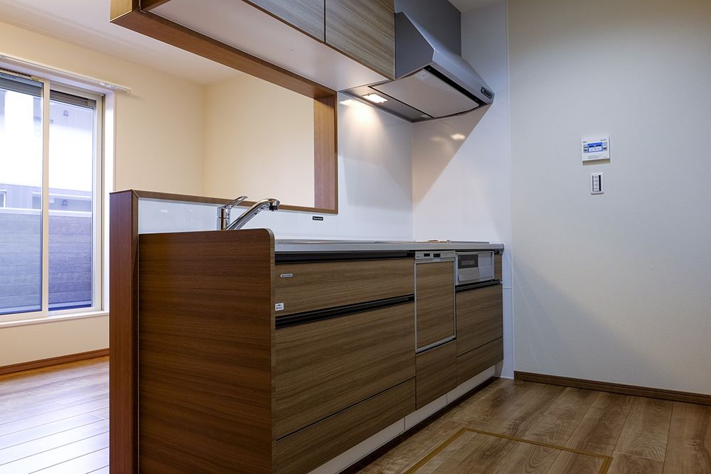 キッチン(ダイニング側)壁付の対面キッチンは、笠木部分を配膳に使えば動線もスムーズです。コンロ前のみ床から天井までの壁があるセミクローズなキッチンは、何かと散らかりがちなキッチンの手元を隠し、ダイニング側からはすっきりと見せる効果があります。 -