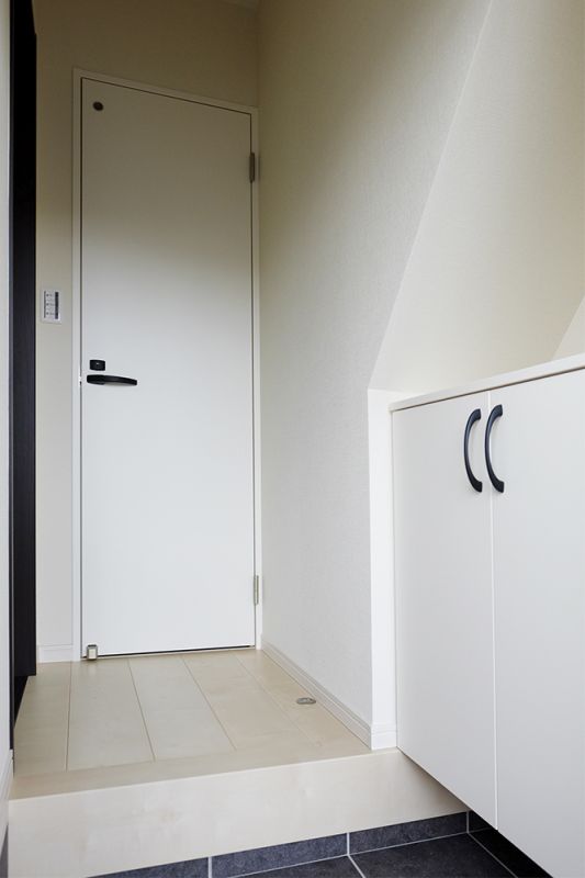 101号室 玄関お部屋の中には、建具や玄関収納のハンドルをブラックカラーで統一しているところもあります。ホワイトカラーと組み合わせると可愛らしいモノトーンコーディネートが完成します。(ドア・玄関収納:ダイケン モノホワイト) -