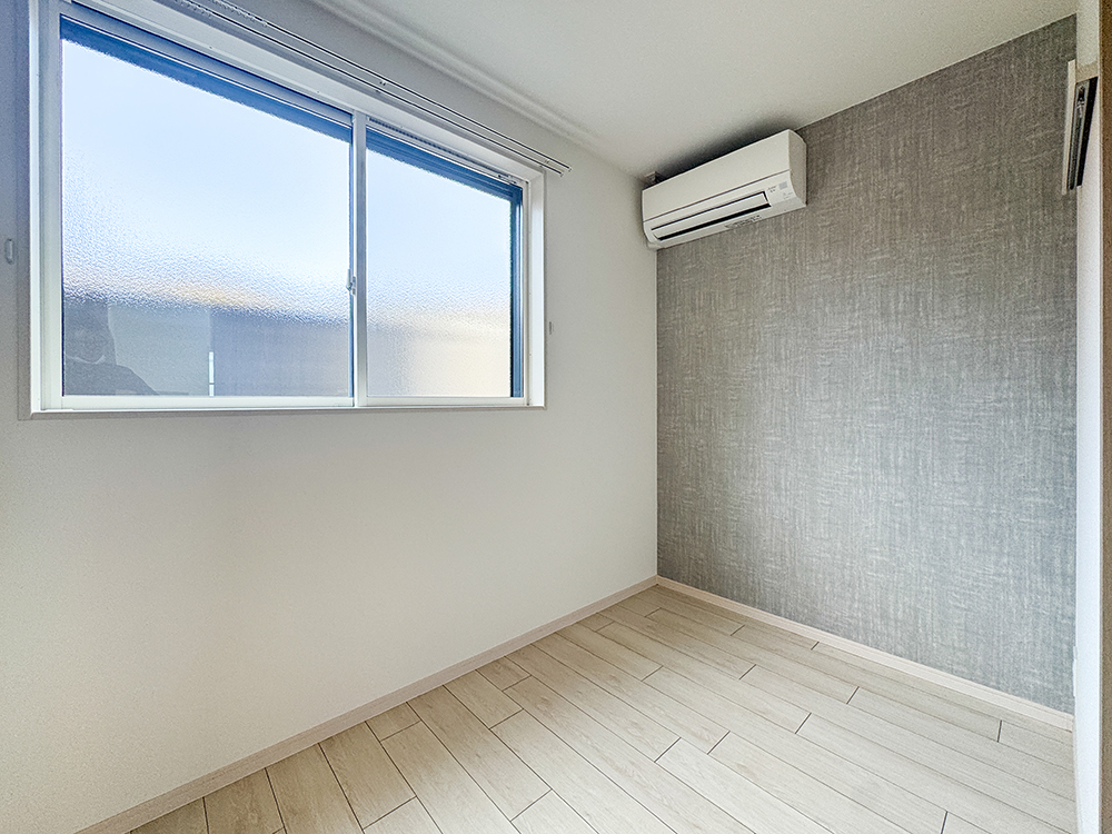LDK(202号室:モダンスタイル) ※102号室も同スタイル明るい木目のフロアと清潔感のある白壁に、落ち着いたグレーのアクセントクロスが調和する、洗練されたLDK。キッチンの前面には、PC作業や読書に最適なカウンターを設けました。壁面を有効活用したリモコンニッチなど、生活感を抑え、スッキリと整った暮らしを叶えます。