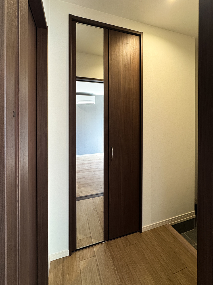 202号室 洗面脱衣室照明付き三面鏡を採用した洗面化粧台。鏡の裏まで活用できる高い収納力が、洗面周りをスッキリと清潔に保ちます。さらに奥にはウォークインクローゼットを設け、身支度や片付けをスムーズに完結できる動線設計になっています。