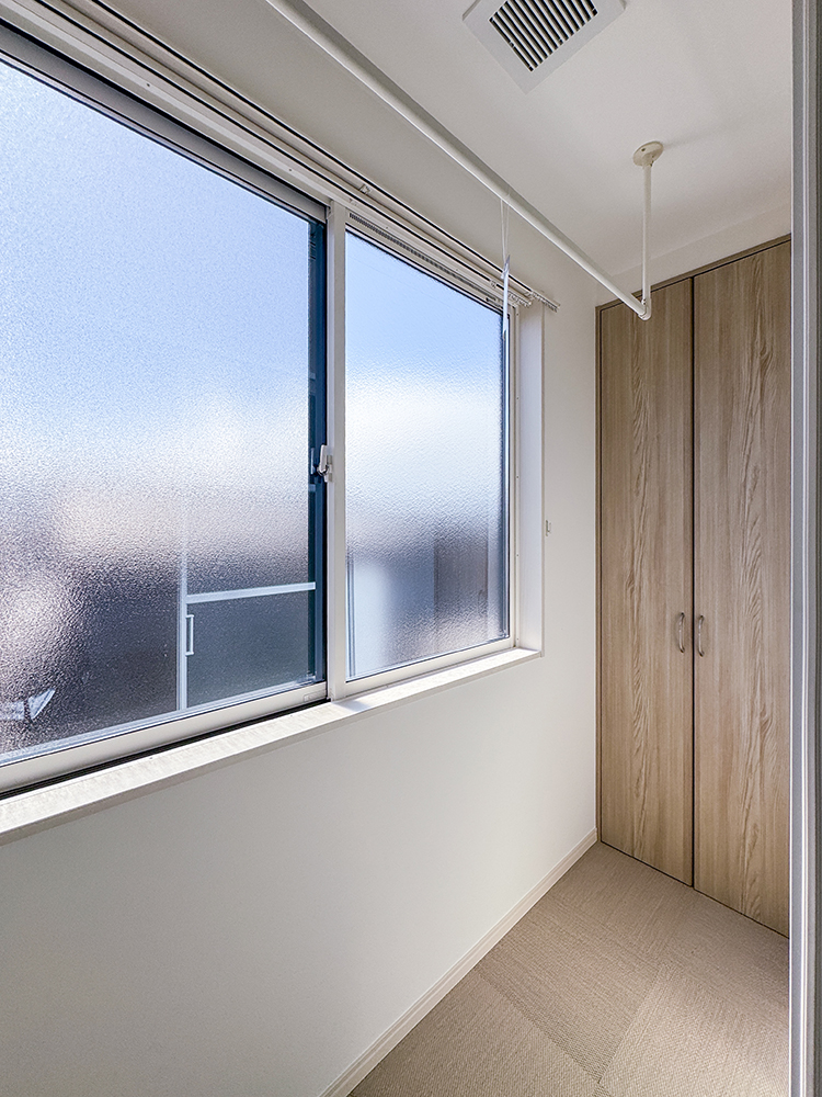 101号室 リビング・サンルームリビングの延長には、明るい光が差し込むサンルームを設けました。天候に左右されることなくスムーズに洗濯物を干すことができます。ハンギングバーと専用の収納スペースを併設し、家事動線もバッチリです。