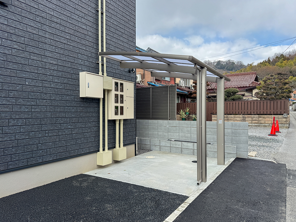 玄関アプローチグレーの濃淡を組み合わせたインターロッキングが、都会的で洗練された玄関アプローチを演出します。全戸に専用の宅配ボックスを完備し、外出中でも荷物を受け取れる、利便性を実現しました。