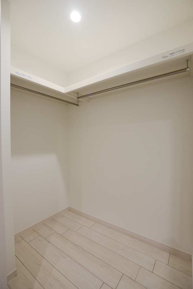 洋室明るく爽やかな洋室空間は、大容量のクローゼット収納に加えおしゃれで便利なハンガーラックを設置。シンプルで使い勝手の良い空間です。(アクセントクロス:サンゲツ SP9733(廃盤)/収納建具:DAIKEN ハピア/色:ネオホワイト/ハンガーラック:Bulls オークホワイト柄) -