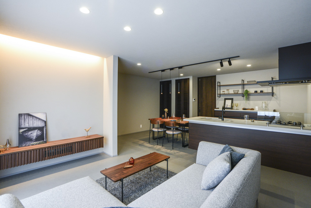 ブラックの建具が織りなすコントラストがシャープな空間を演出。
