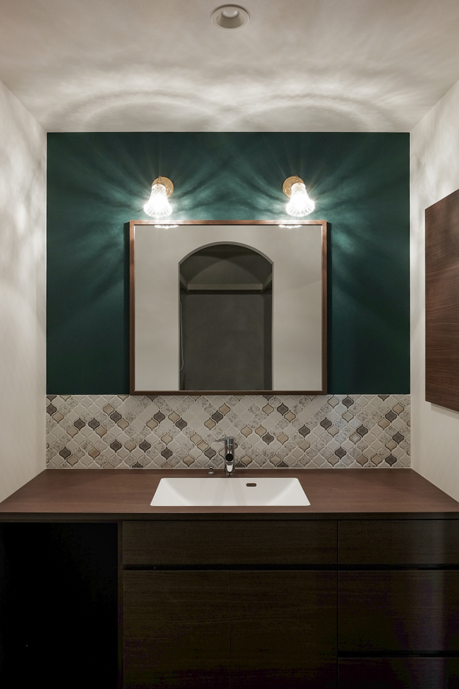 グリーンはタイルや造作洗面台の色味とすごく合っているし、何より個性的で可愛い!